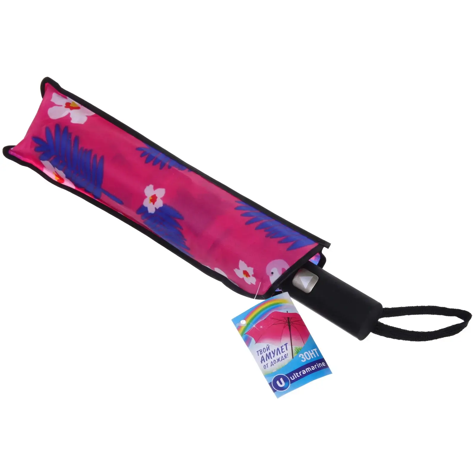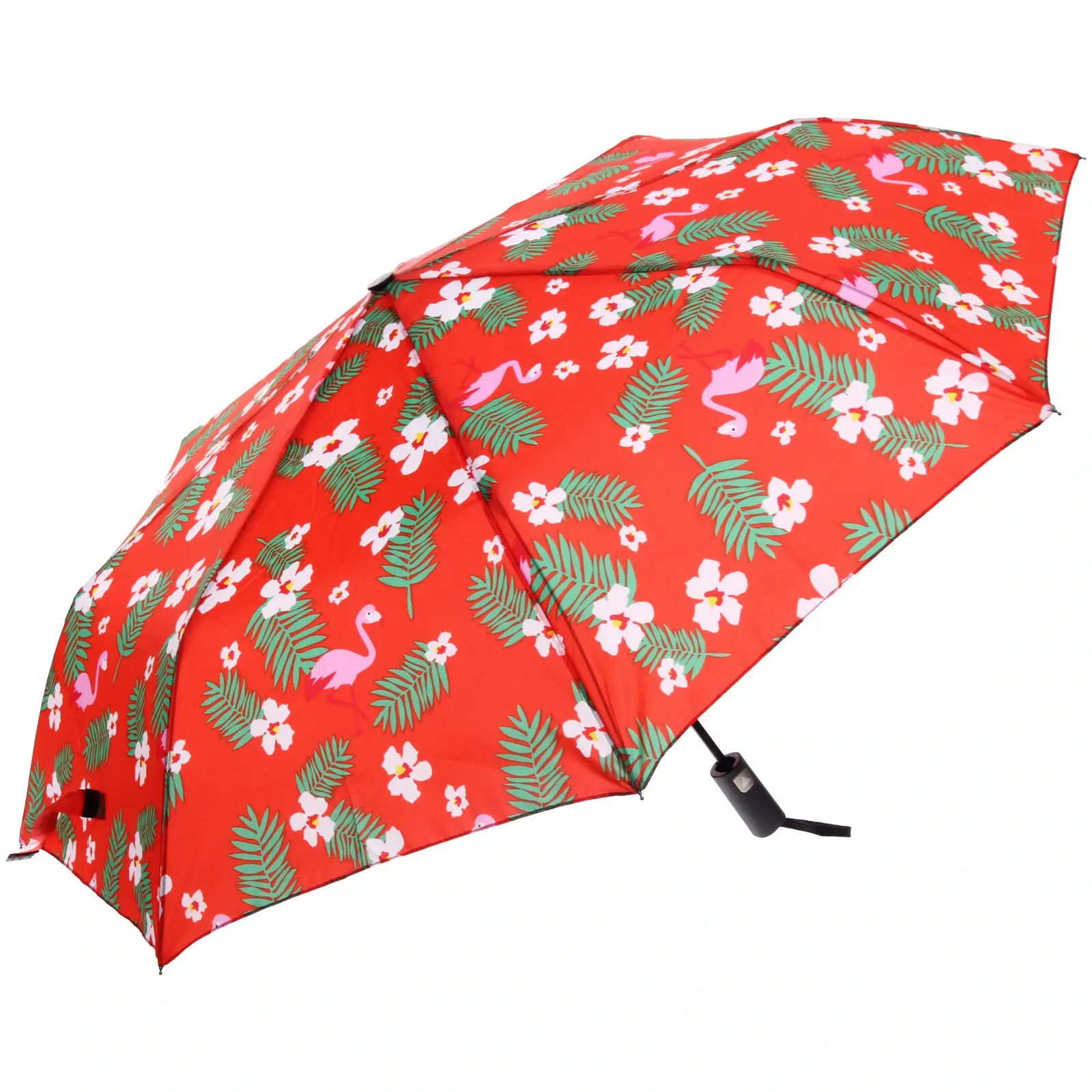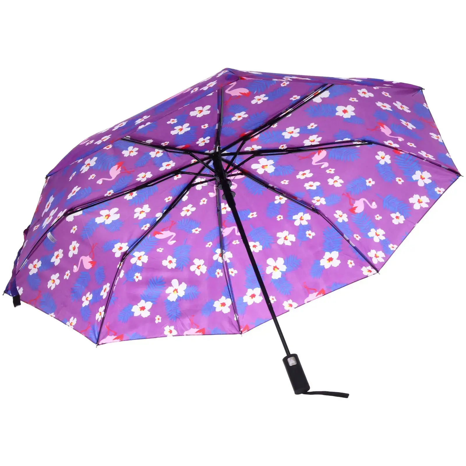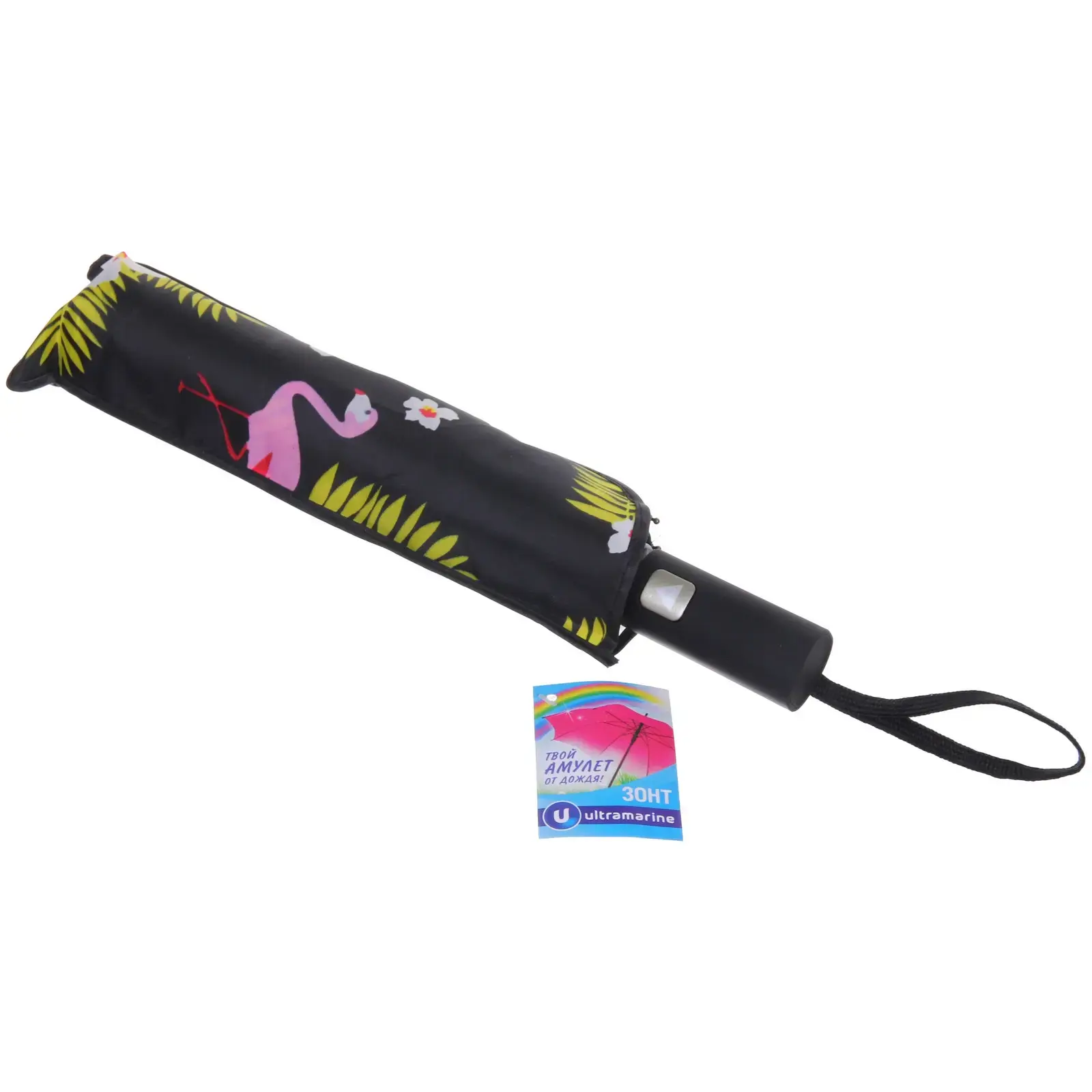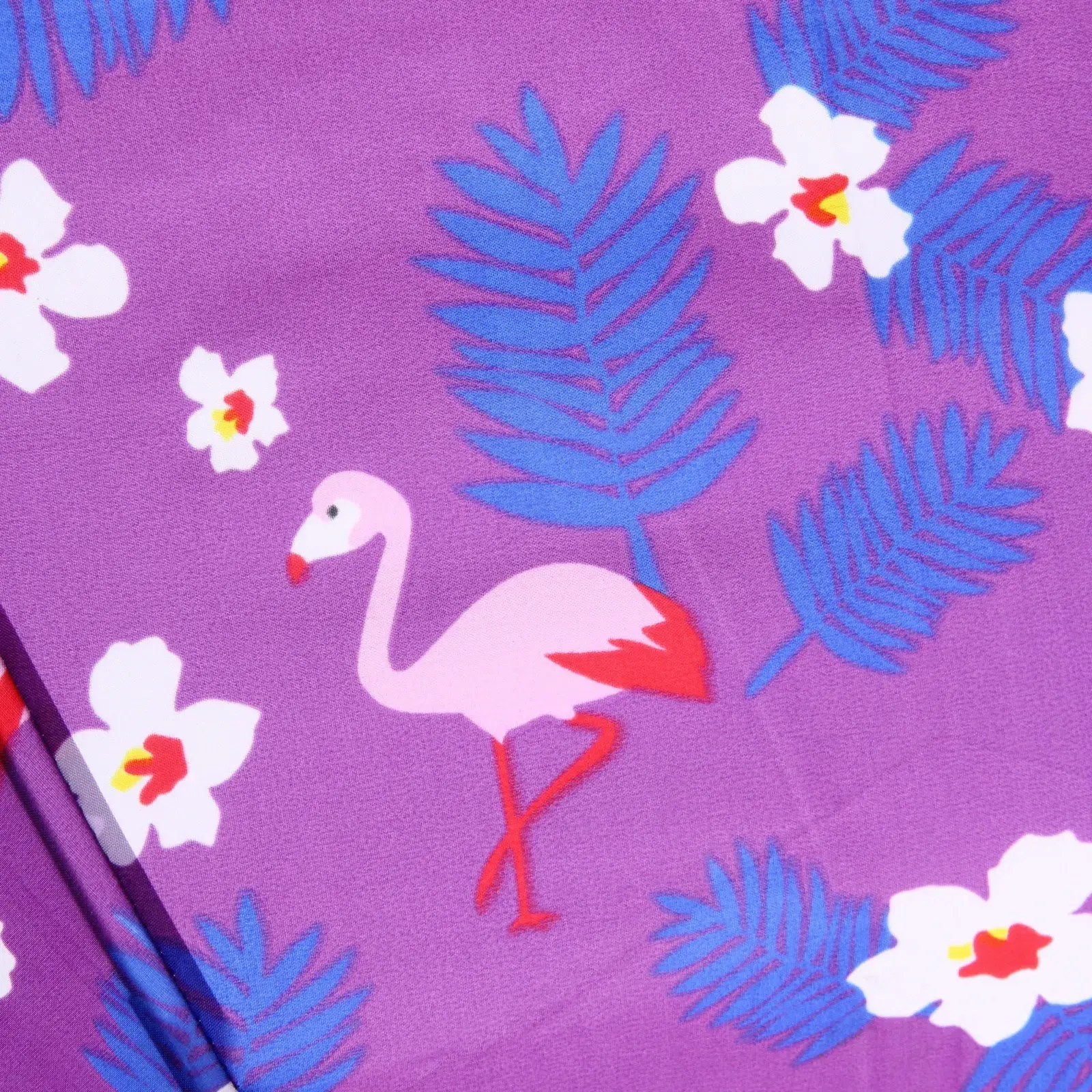 Зонт представлен в ассортименте из 6 ярких расцветок с тропическими мотивами: фламинго, экзотические цветы и листья на различных цветовых базах (розовый, фиолетовый, черный и другие). Цвет определяется случайным образом при отгрузке.