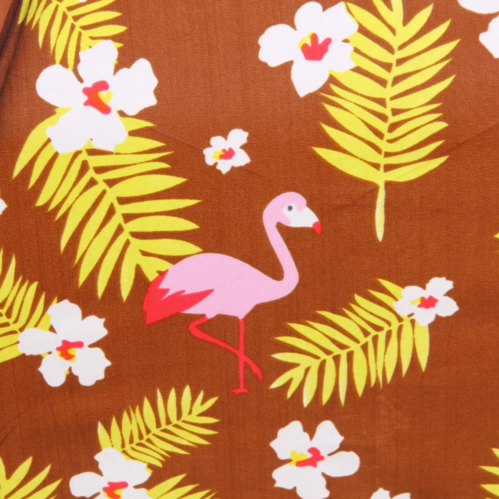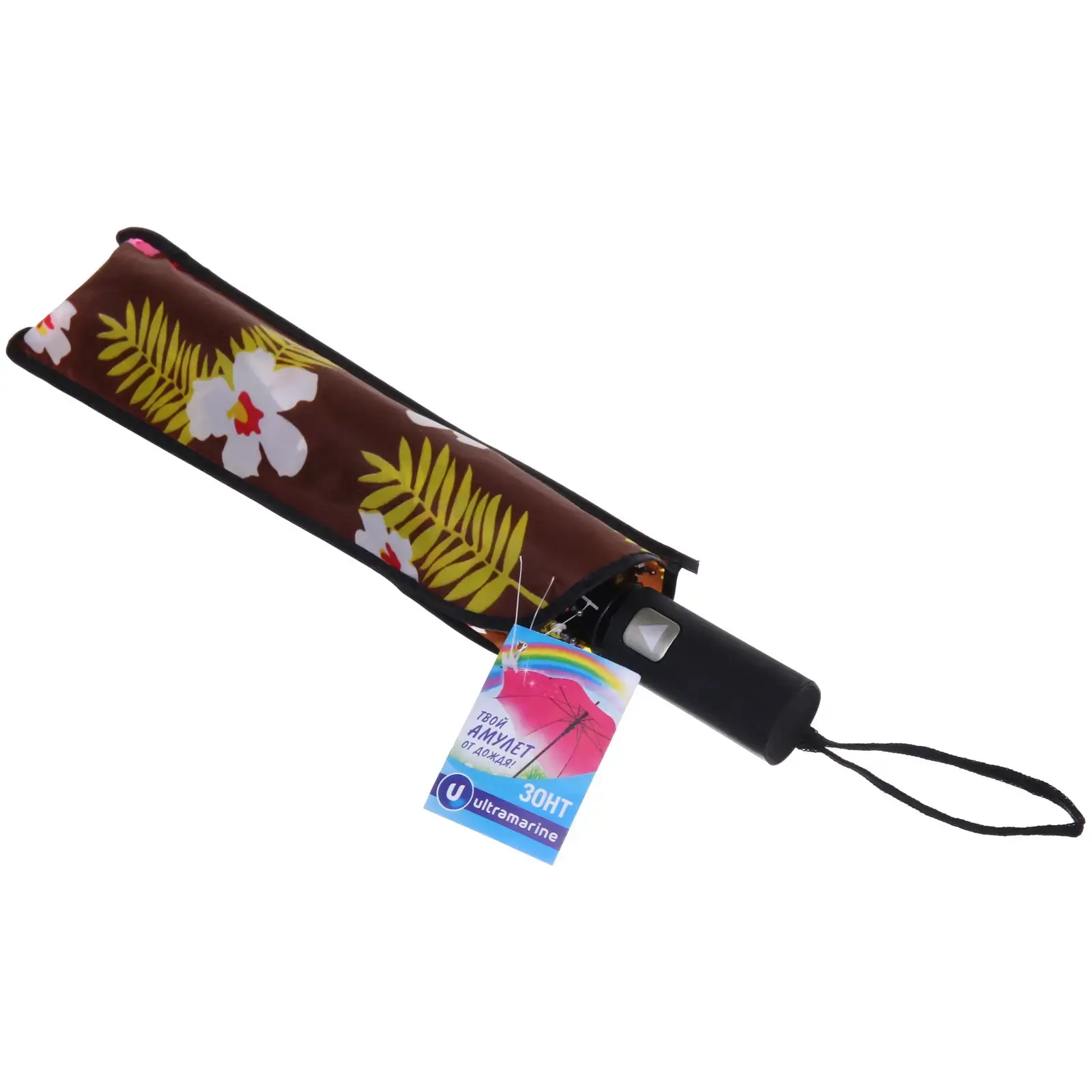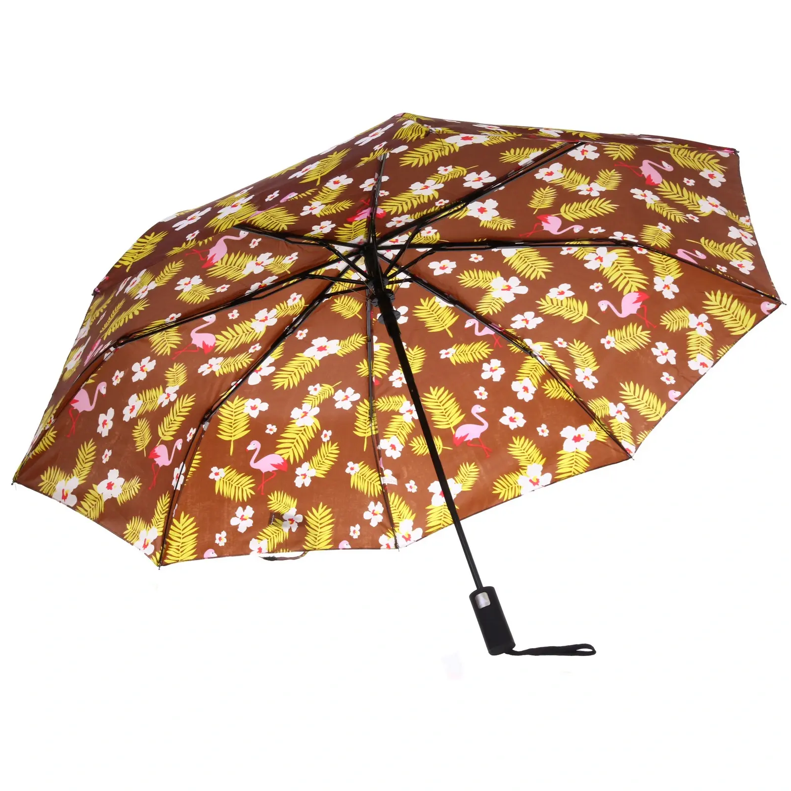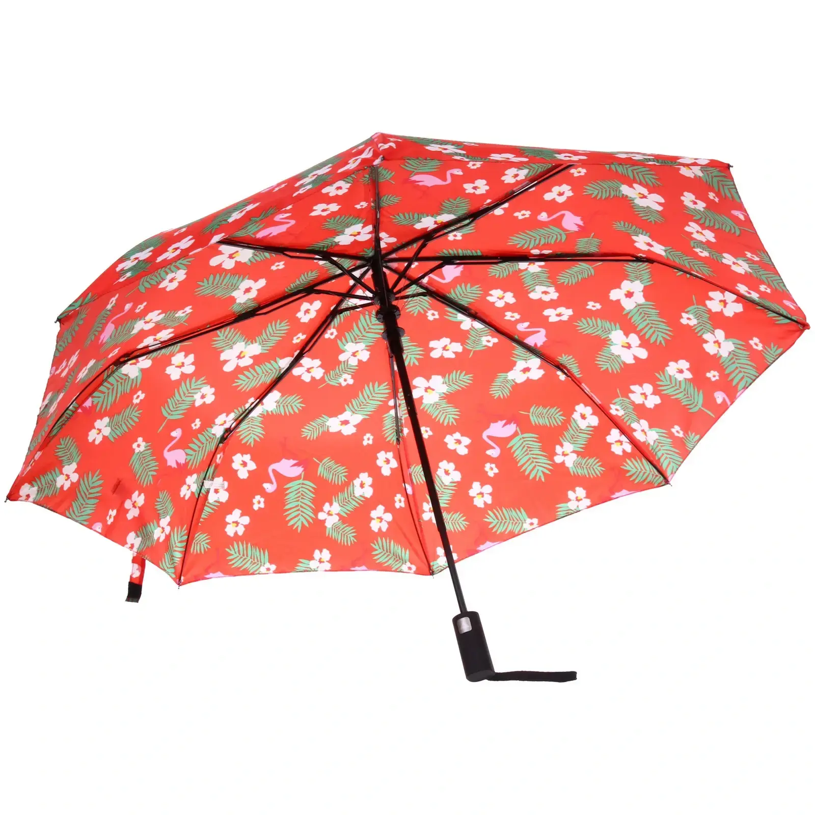 Зонт представлен в ассортименте из 6 ярких расцветок с тропическими мотивами: фламинго, экзотические цветы и листья на различных цветовых базах (розовый, фиолетовый, черный и другие). Цвет определяется случайным образом при отгрузке.
