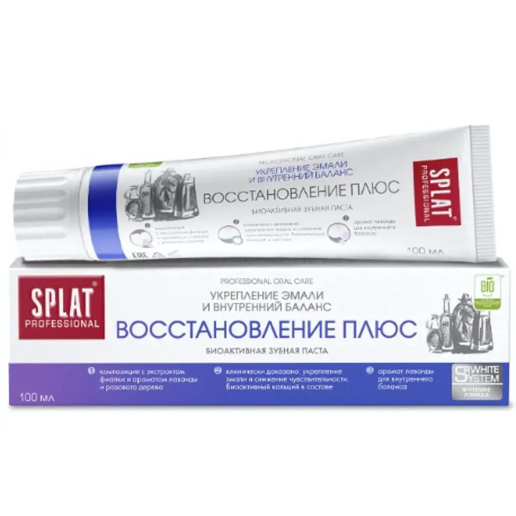 Подарите своим зубам надежную защиту и восстановление с зубной пастой SPLAT Professional Восстановление Плюс. Эта паста не только очищает, но и укрепляет эмаль, обеспечивая внутренний баланс и здоровье вашей полости рта. Благодаря уникальной биоактивной формуле, она эффективно борется с проблемами зубов и десен, даря вам уверенность в каждой улыбке.