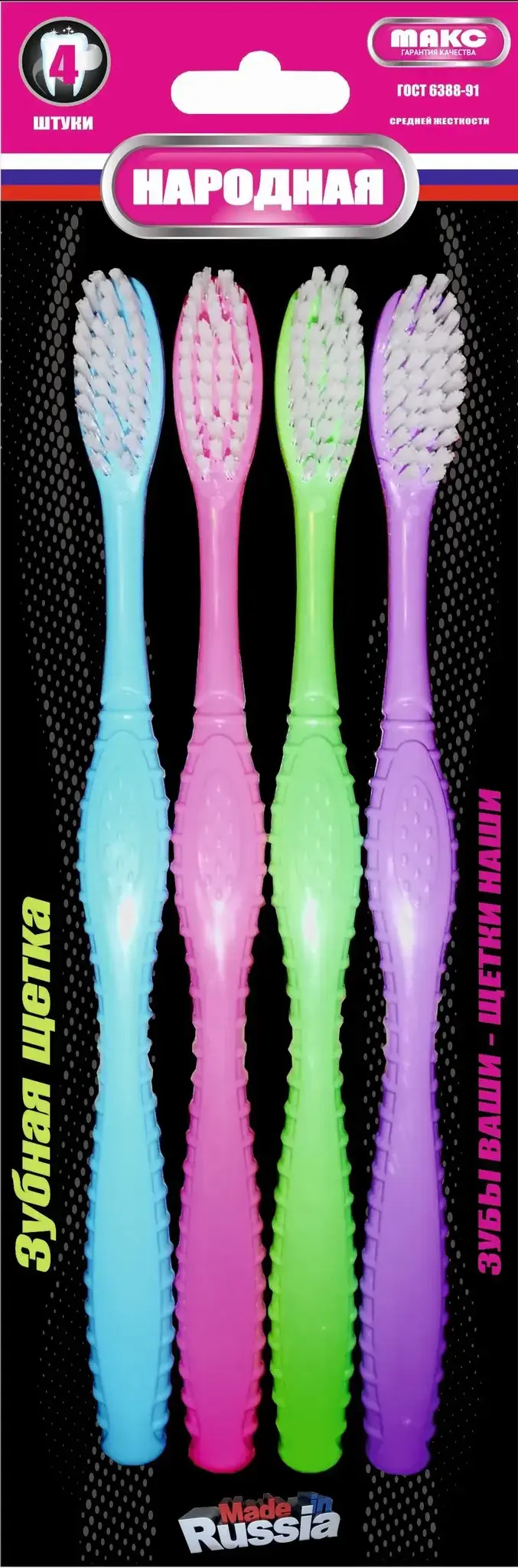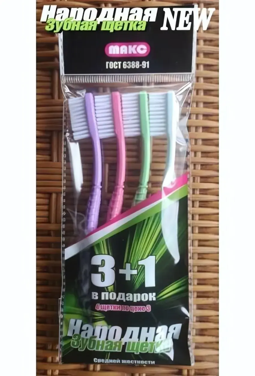 Зубная щетка 'Народная' создана для тех, кто ценит качество и практичность. Комплект из 4 щеток разных цветов позволяет каждому члену семьи выбрать свою любимую модель.