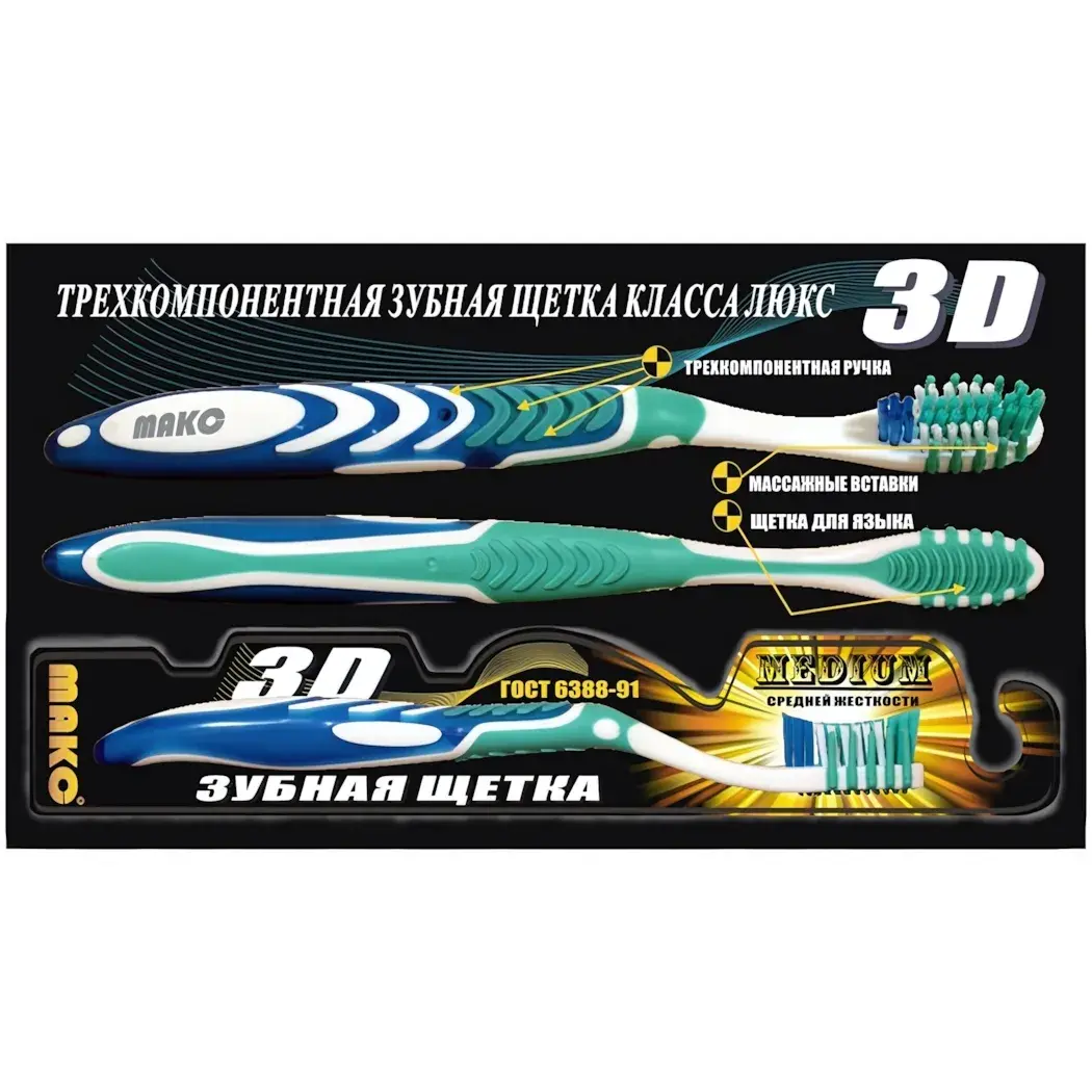 Зубная щетка MAKO 3D, средней жесткости, с массажными вставками и щетиной для языка