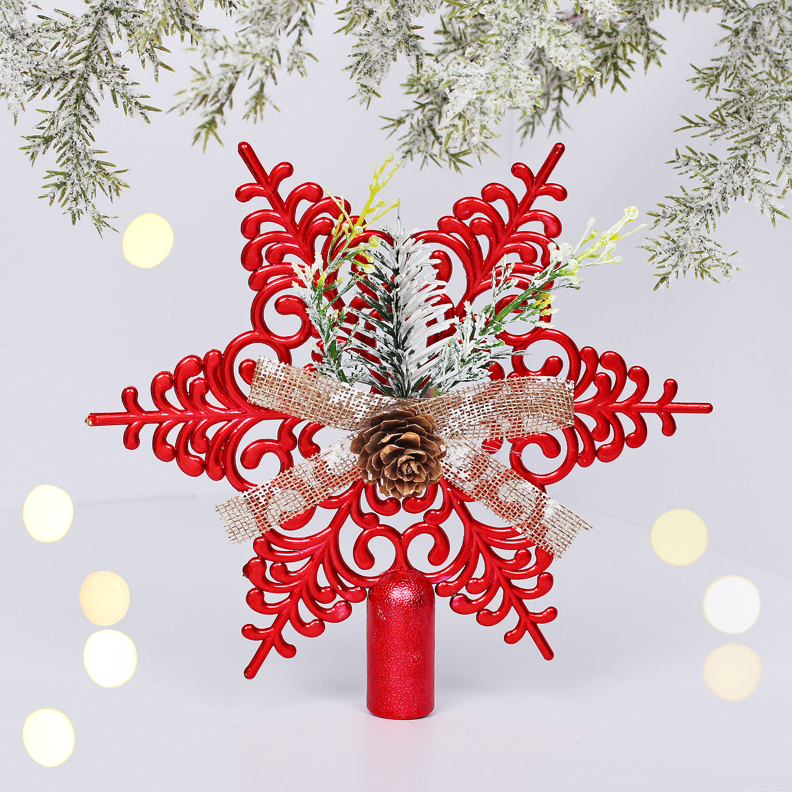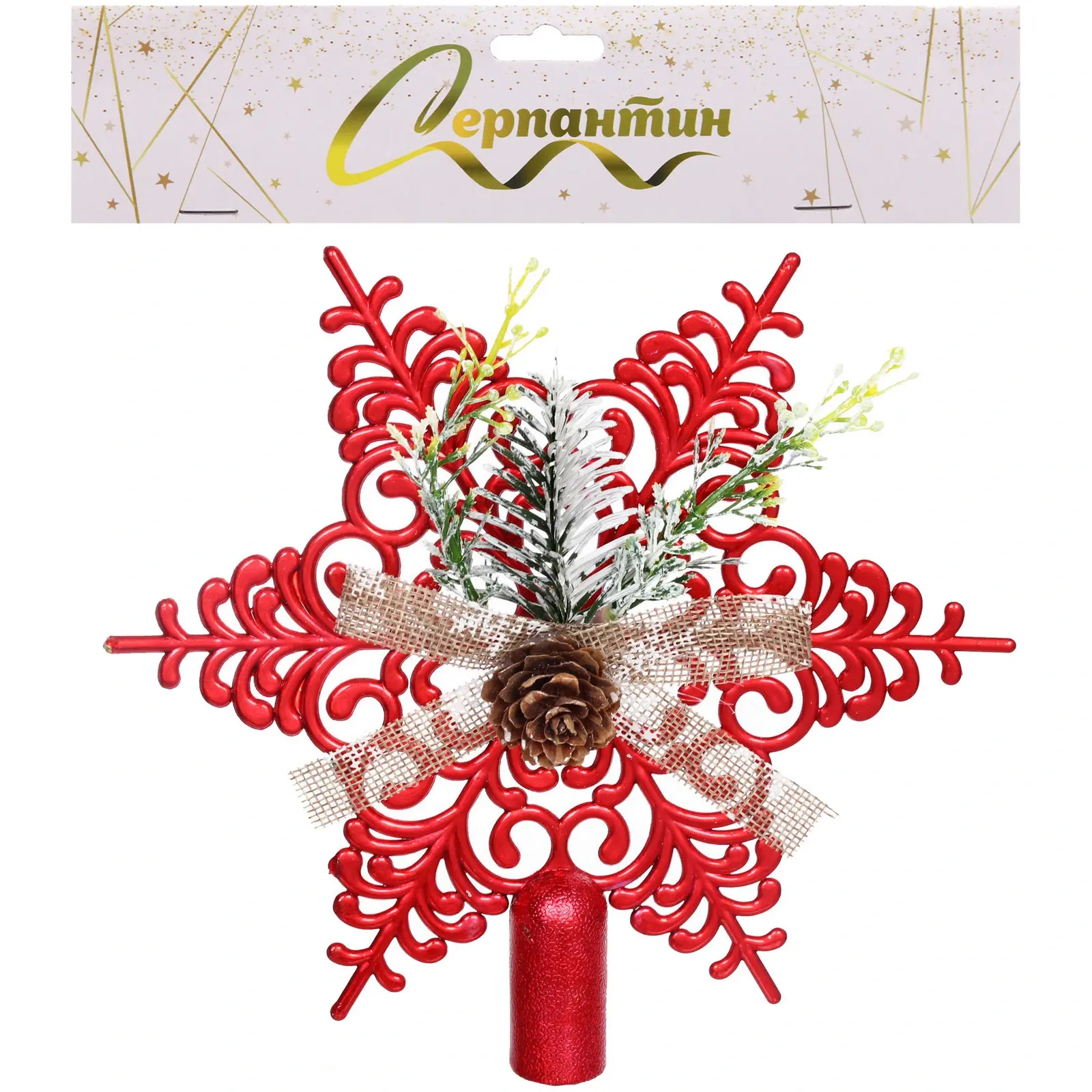 Верхушка размером 19*19 см идеально подходит для стандартных и высоких ёлок. Материал: качественный пластик с элементами текстильного декора. Цвет: насыщенный красный с декоративными акцентами в зелёных, белых и коричневых тонах.