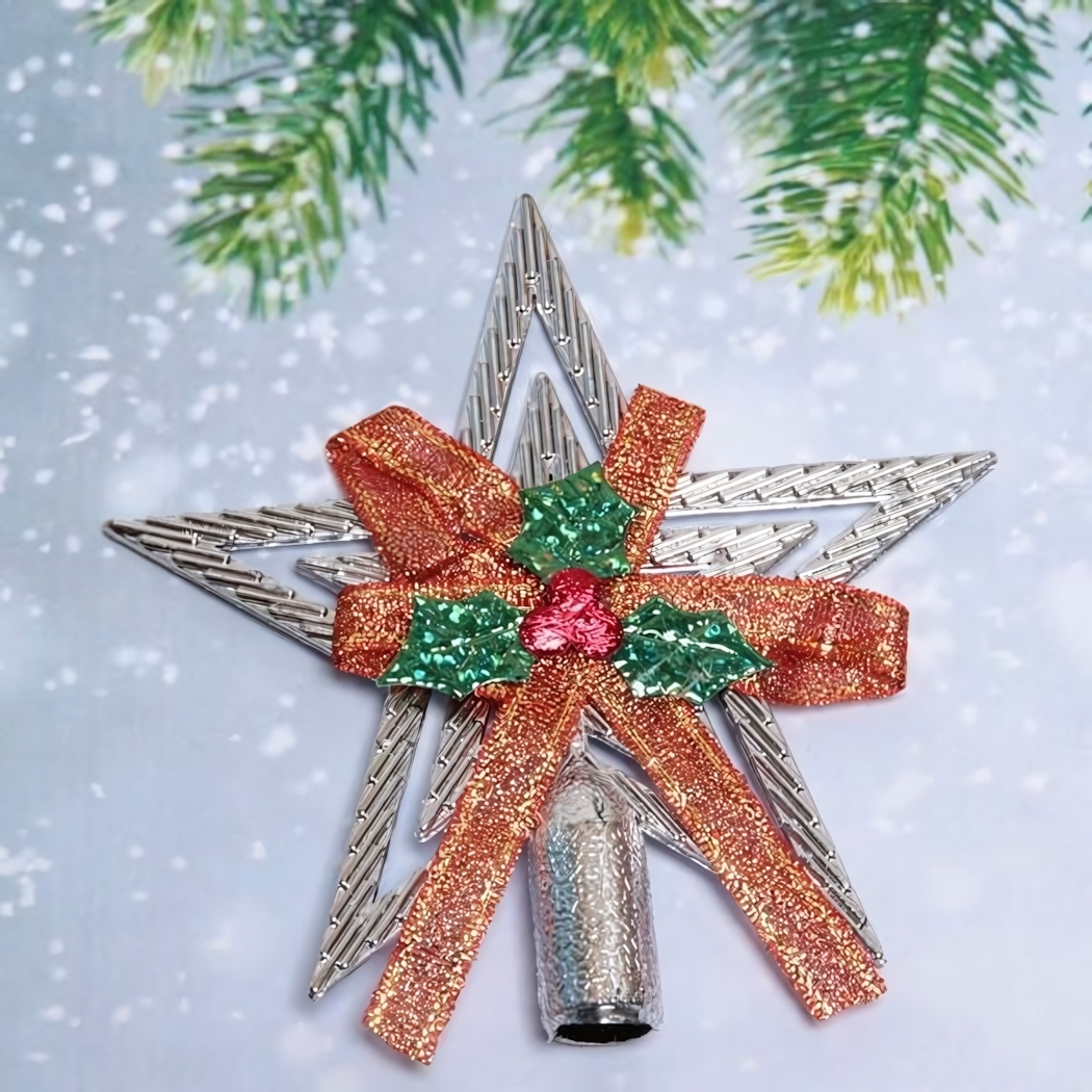 Создайте завершенный и стильный образ вашей новогодней елки с верхушкой-звездой «Классика». Серебристый блеск пятилучевой конструкции в сочетании с аккуратным бантом, зелеными листьями и яркой красной ягодкой придает наряду вашей ели праздничный, теплый и уютный характер.