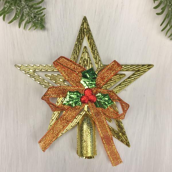 Звезда выполнена из двух вложенных контуров пятиконечной формы с рельефной текстурой, имитирующей полоски. В центре размещён бант из красной блестящей ленты, дополненный зелёными листьями и яркими красными ягодами. Крепление в виде цилиндрической вставки обеспечивает удобную и надёжную установку на макушке ёлки.