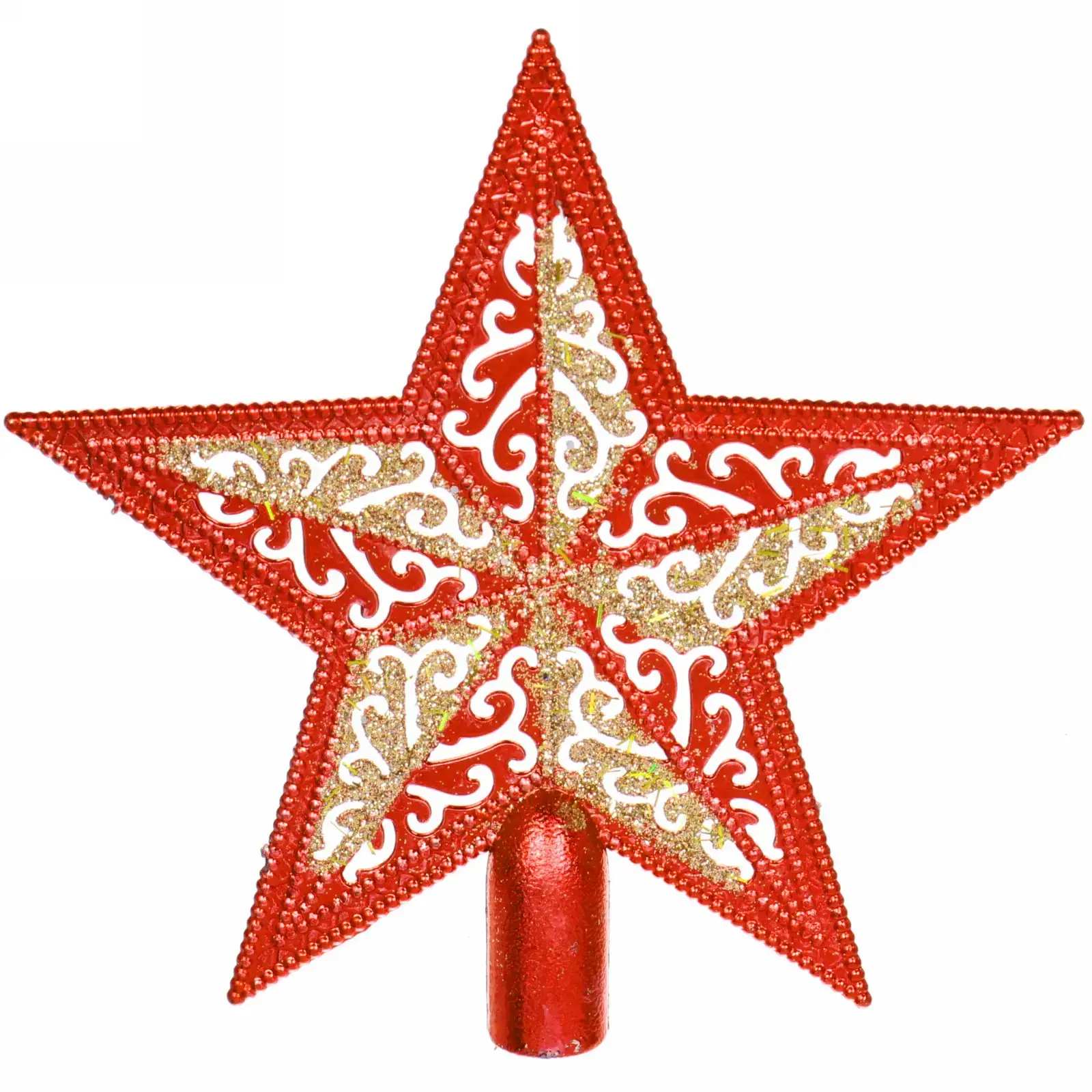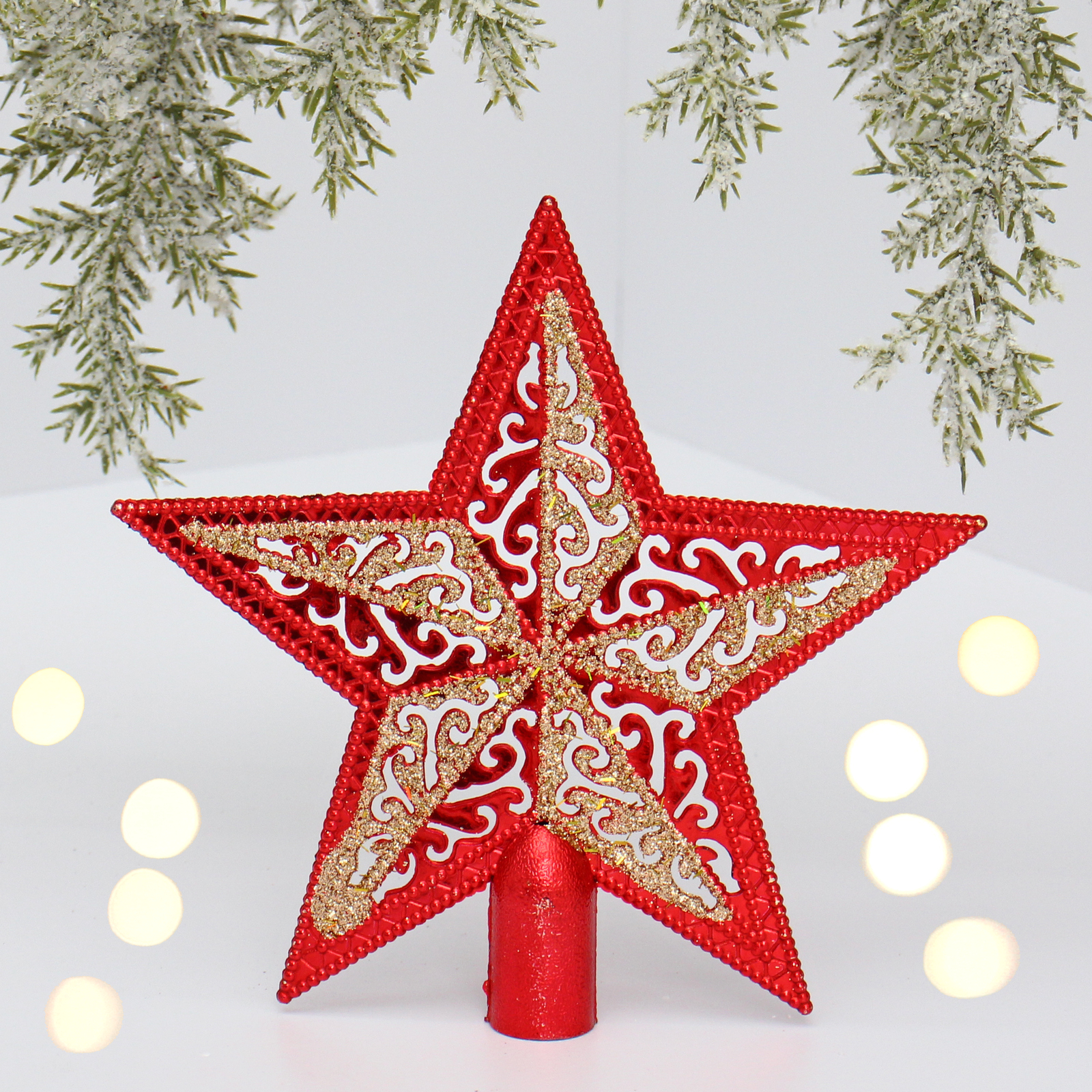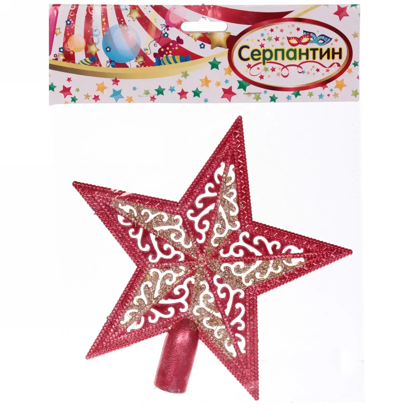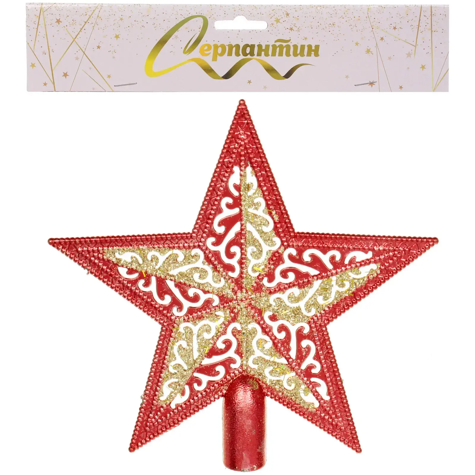 Звезда имеет размер 15х15 см и выполнена в ярком красном цвете, украшенном золотистыми и белыми декоративными элементами. Она идеально подходит для установки на верхушку ёлки, добавляя завершённость вашему новогоднему декору. Благодаря своей цилиндрической опоре, звезда легко крепится и надежно держится на месте.