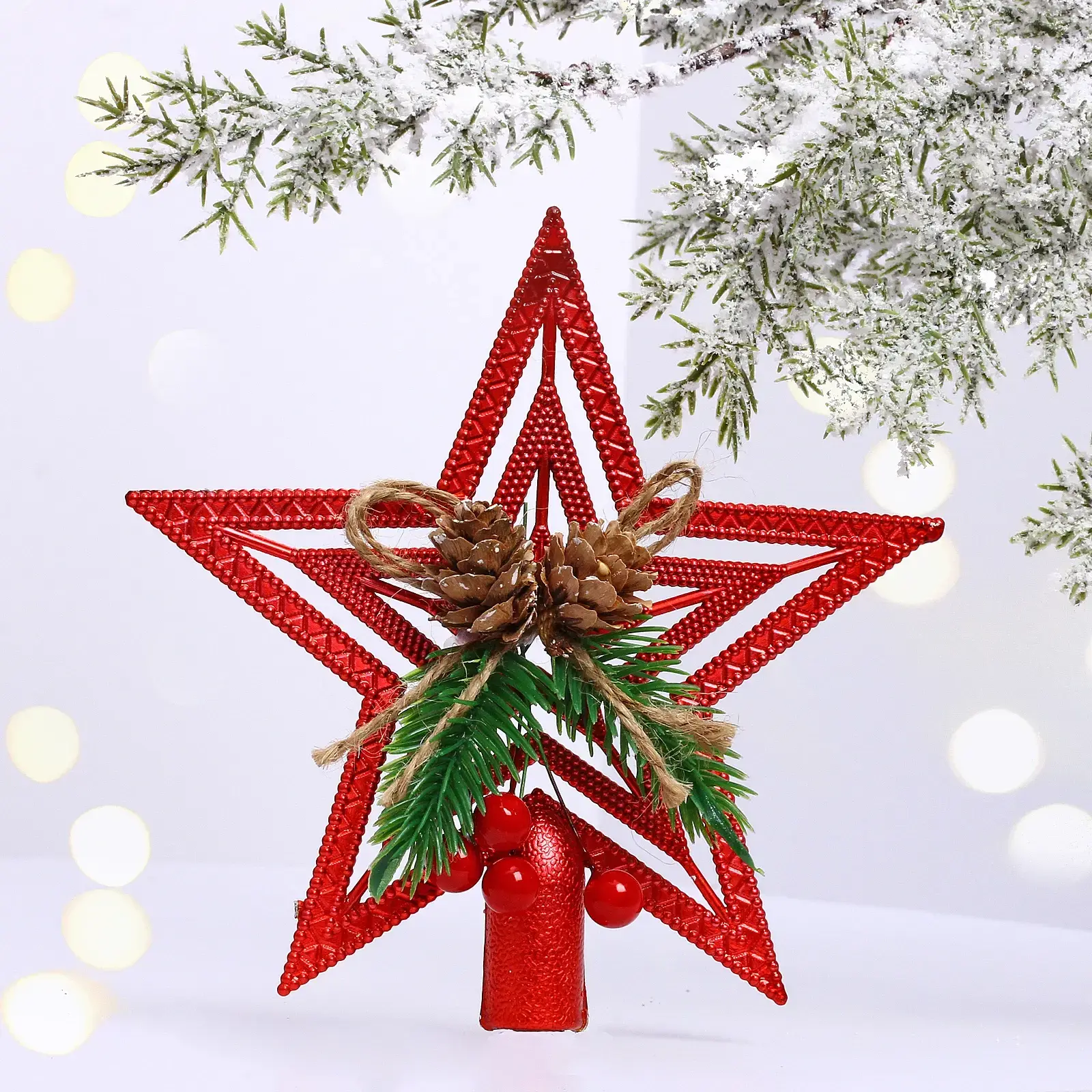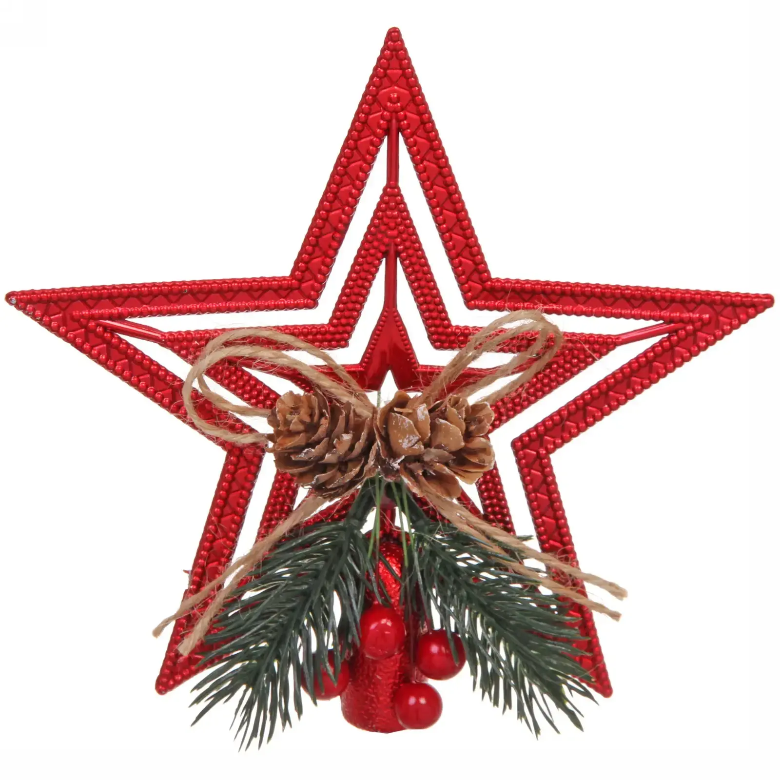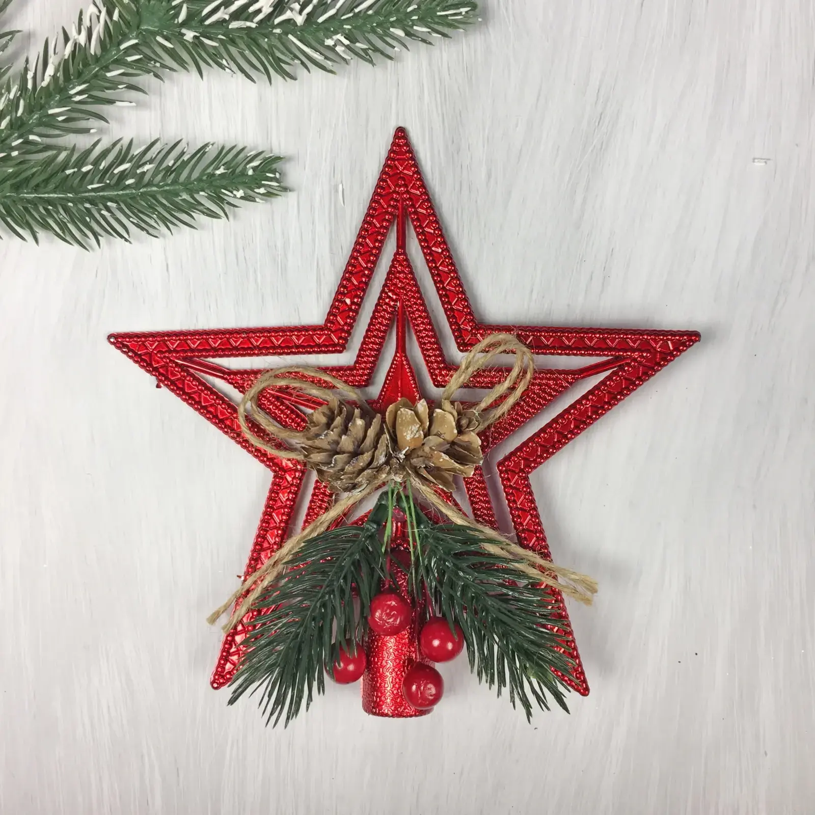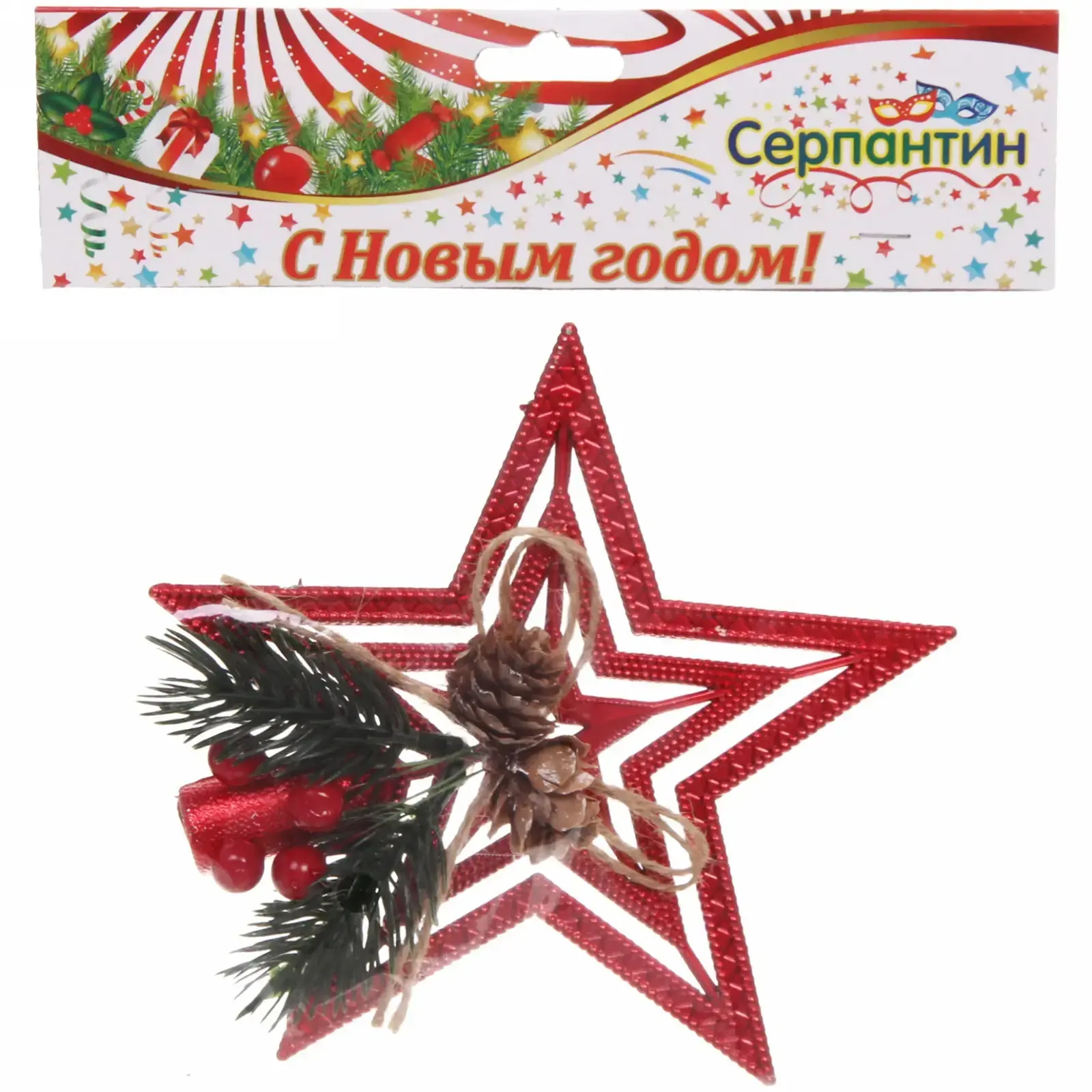 Звезда выполнена из легкого и долговечного пластика, что делает её безопасной для использования в домашних условиях. Она украшена натуральными элементами, такими как шишки и ягодки, что придаёт ей особый шарм. Не упустите возможность добавить эту великолепную звезду в вашу коллекцию новогодних украшений!